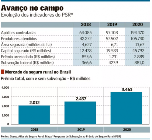 No ano passado, o PSR aplicou R$ 881 milhões em subvenções ao prêmio, mais que o dobro de 2019. Com mais recursos, o número de produtores atendidos pelo programa cresceu 84%, o de apólices contratadas avançou 108%, enquanto a área segurada subiu 104% e o capital segurado, 134%.