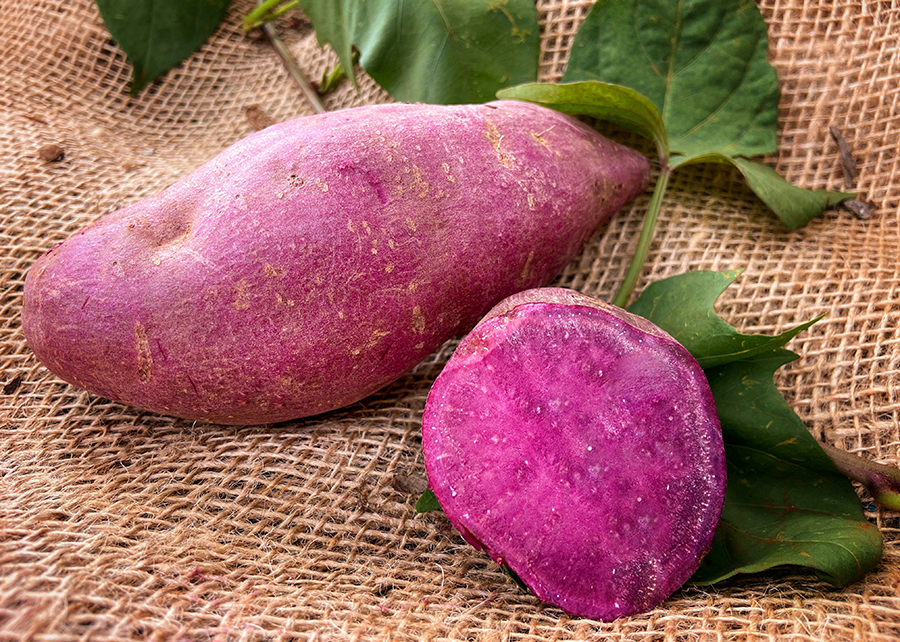 A coloração arroxeada das batatas-doces BRS Cotinga e BRS Anembé (foto abaixo) deriva do alto teor de antocianinas, que são pigmentos naturais responsáveis pelos tons de azul, roxo e vermelho em alimentos como frutas, raízes e folhas. As antocianinas e demais compostos fenólicos presentes na batata-doce de polpa roxa são substâncias bioativas associadas à redução do risco de doenças degenerativas, uma vez que possuem ação antioxidante e anti-inflamatória no organismo.